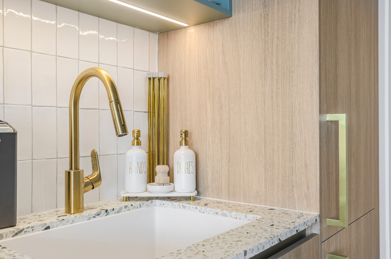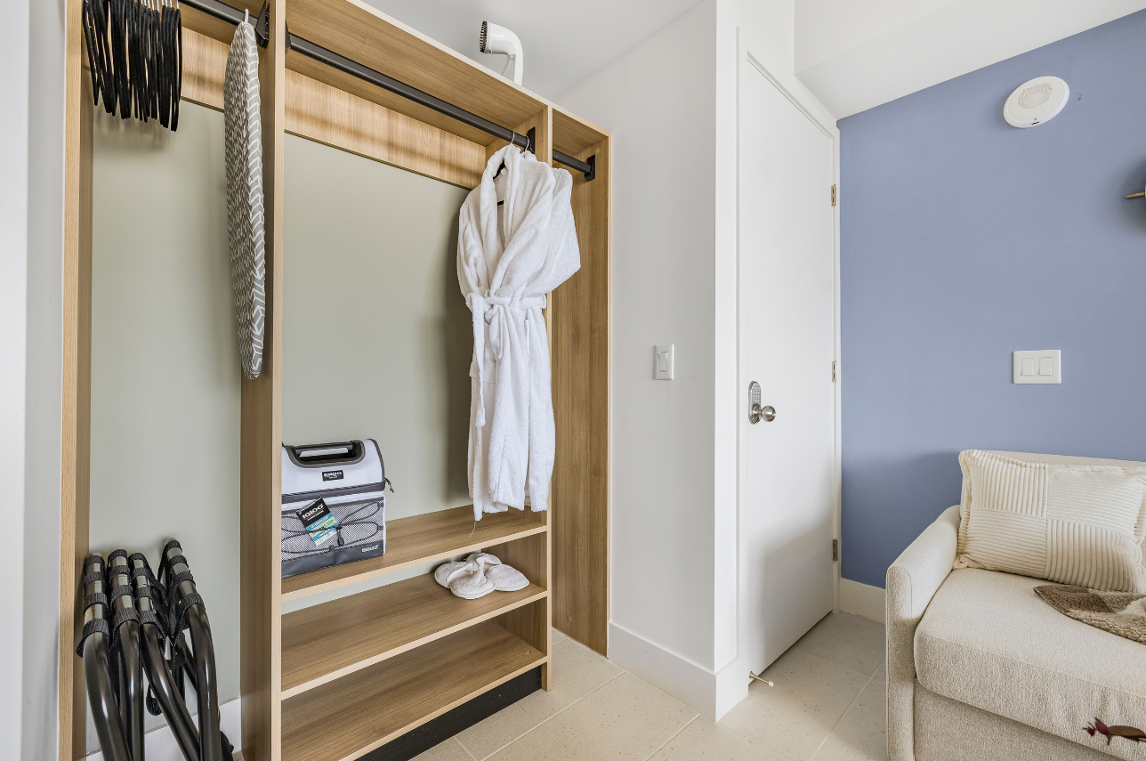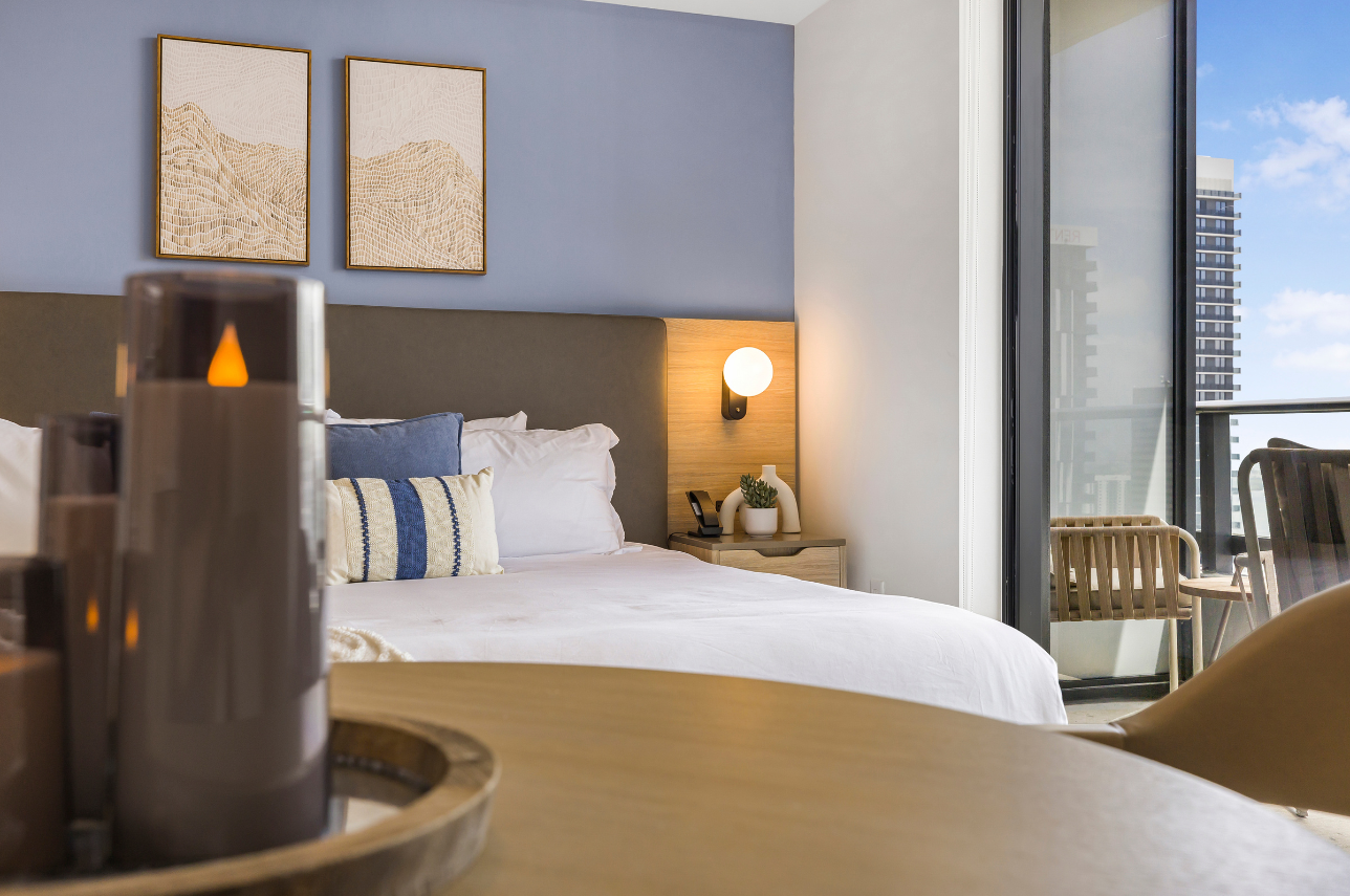 Thoughtfully styled with a soft palette of blue, beige, and gold, the Calm Blue Room is designed to soothe. With natural light flowing in through floor-to-ceiling windows and romantic sunrise views from the balcony, this south-facing studio offers both beauty and peace.