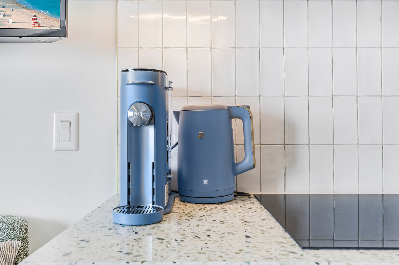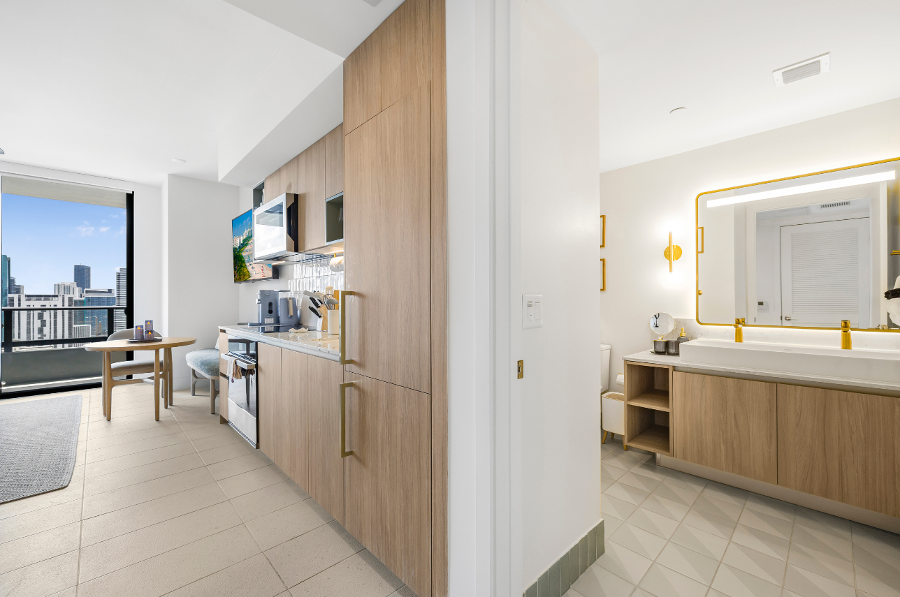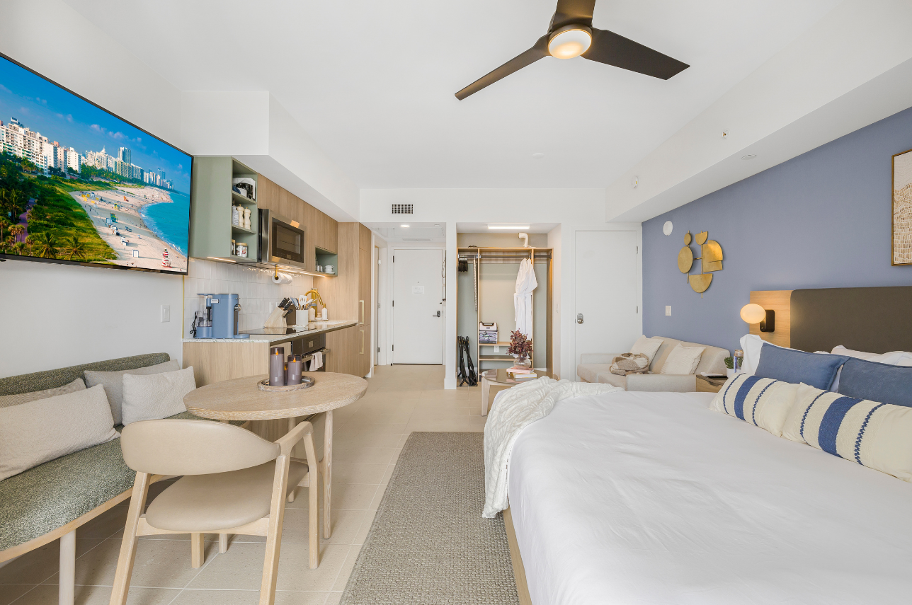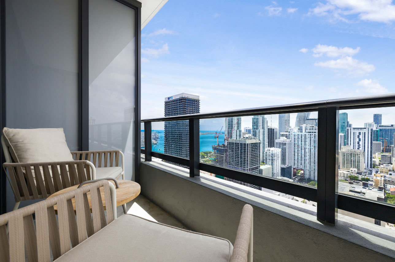 Welcome to the Calm Blue Room, a serene, design-forward studio where soft blues, golds, and warm textures invite you to relax and reconnect. Perfect for couples on a romantic escape or small families, this peaceful hideaway features a private balcony with dreamy views of Brickell, the marina, and Miami’s morning skyline. Whether you’re here for leisure, love, or a mix of both, this cozy space brings comfort and calm to the heart of the city.