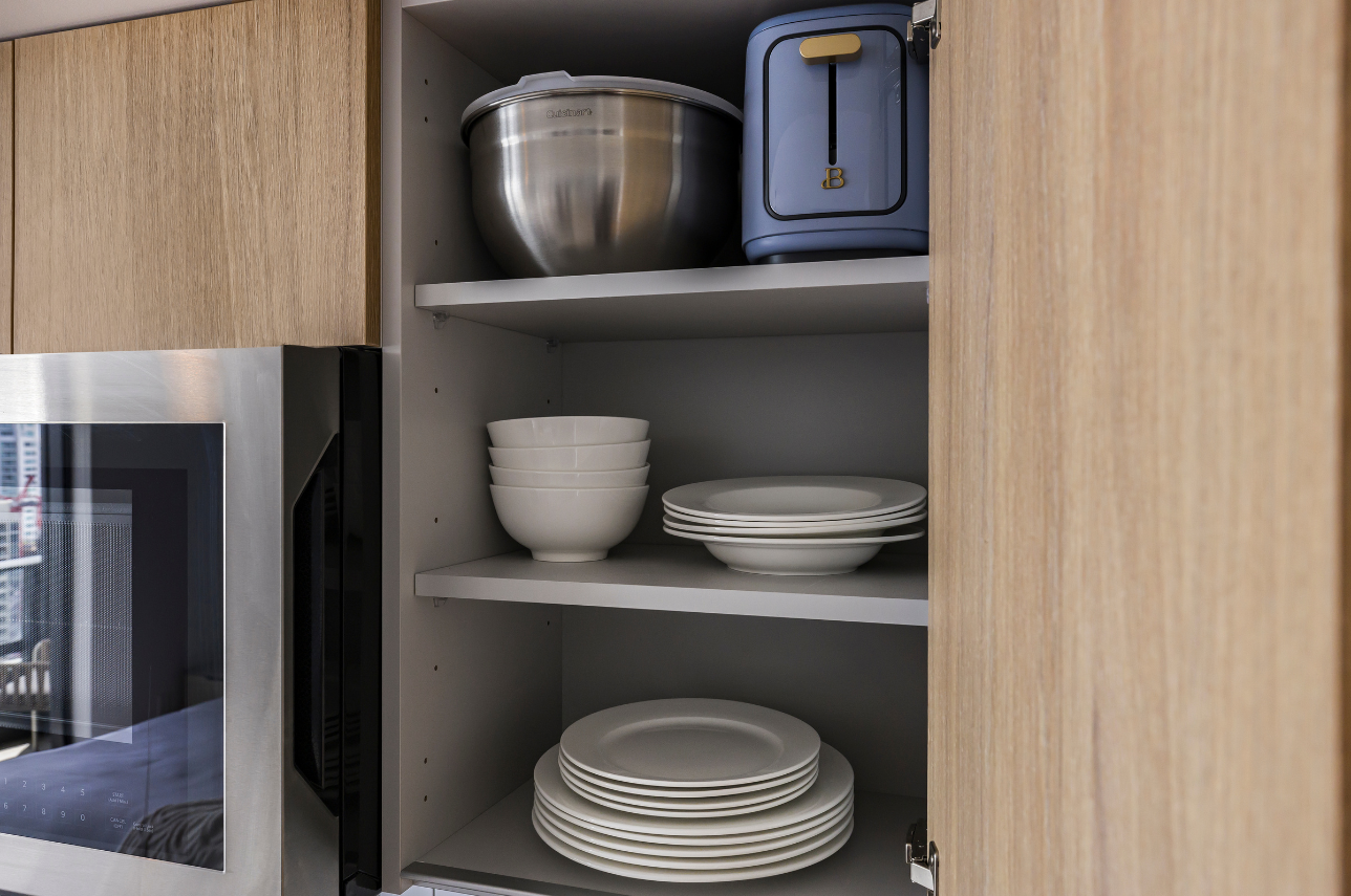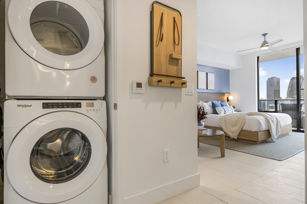 Unwind in the plush king-size bed, enjoy a candlelit dinner in the dining nook, or sip your morning coffee while the city comes to life below. From the elegant décor to the well-equipped kitchen and full laundry setup, this unit blends simplicity with heartfelt design, ideal for couples.