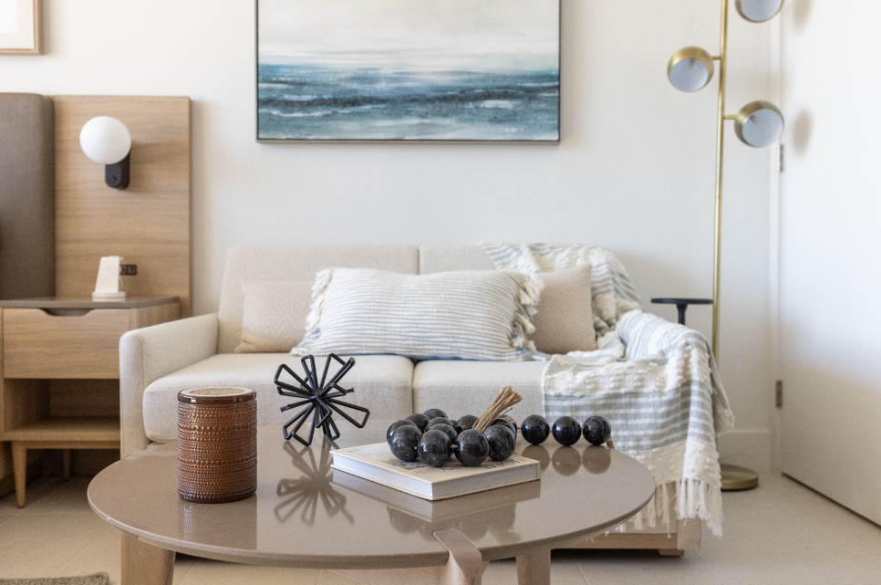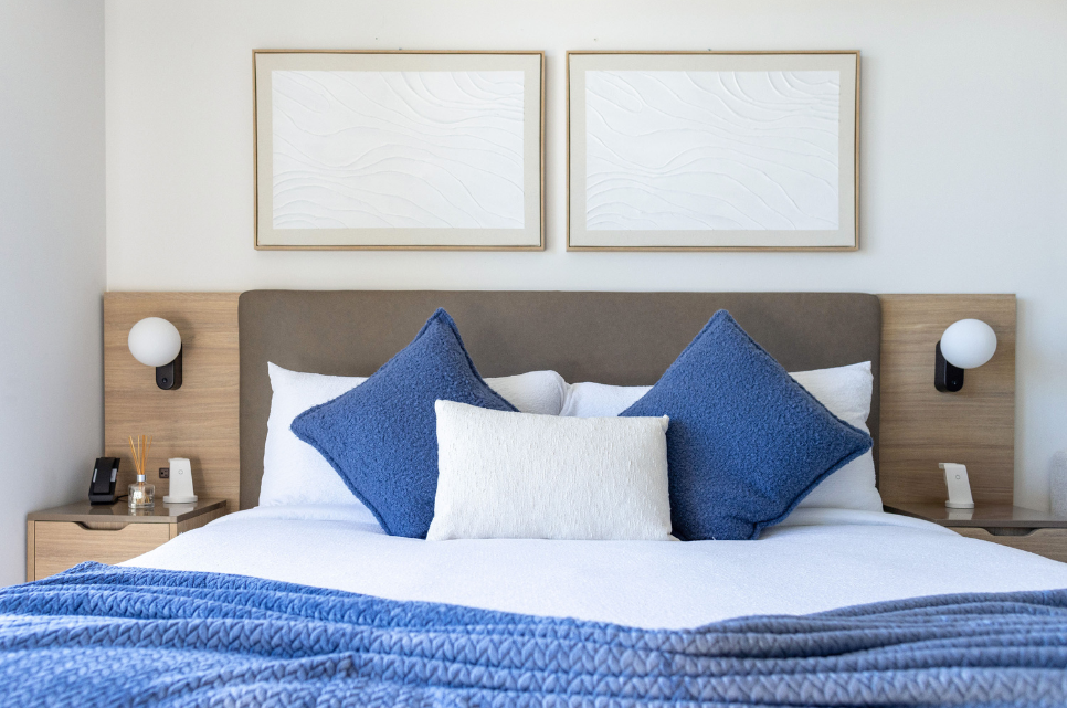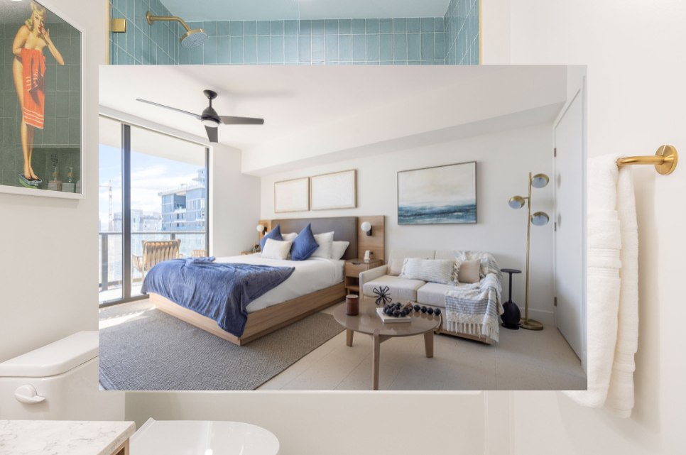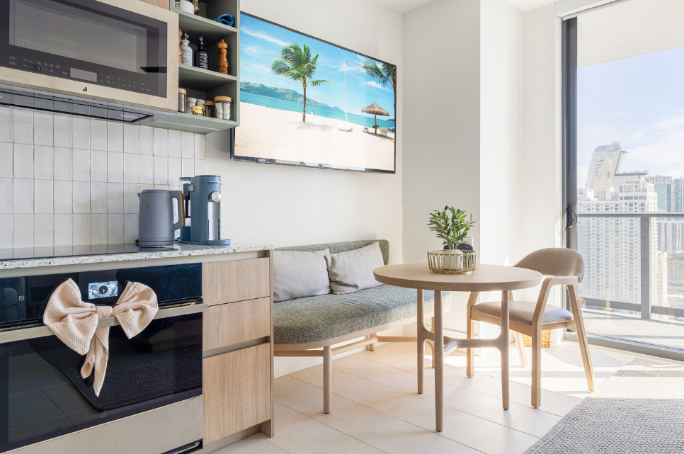 Welcome to Downtown Studio Retreat, a stylish and serene hideaway perfectly suited for couples and solo travelers. With cozy-yet-refined decor in soft blue, beige, and natural wood tones, this elevated studio offers a king-size bed, a full kitchen, and a private balcony with sweeping views of Downtown Miami, Brickell, and the bay. Whether you’re here to relax, explore, or work remotely, this retreat brings together elegance, light, and location in one perfect package.