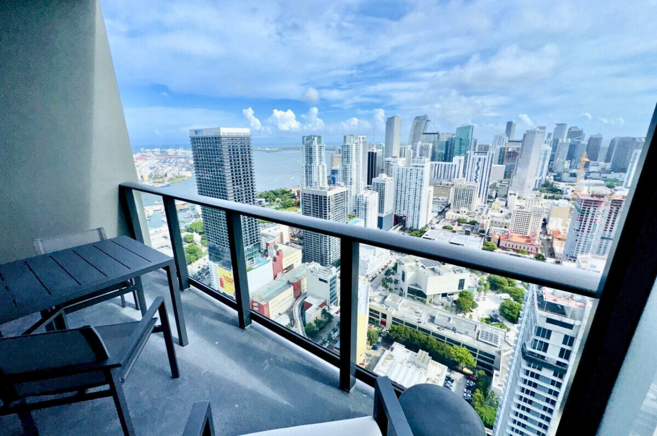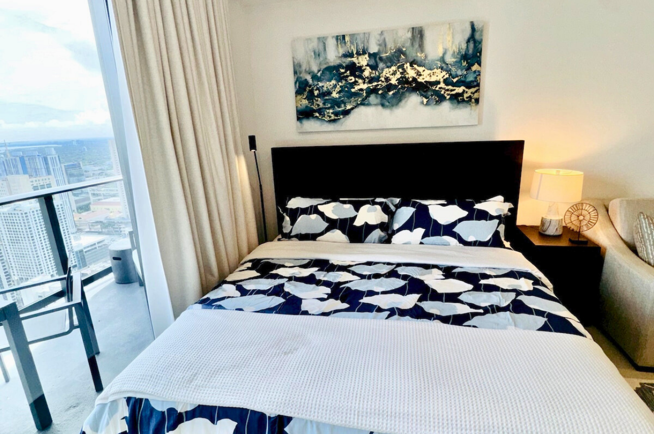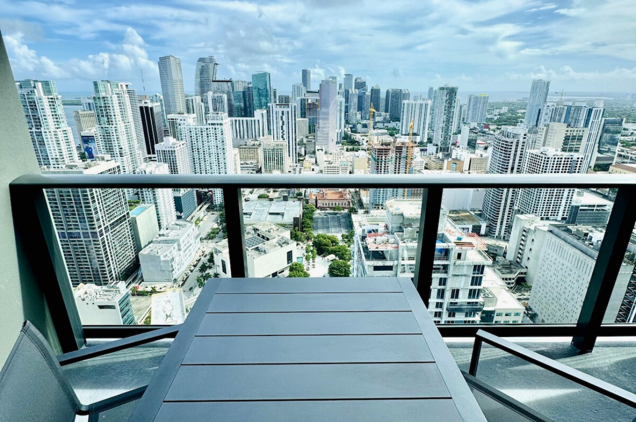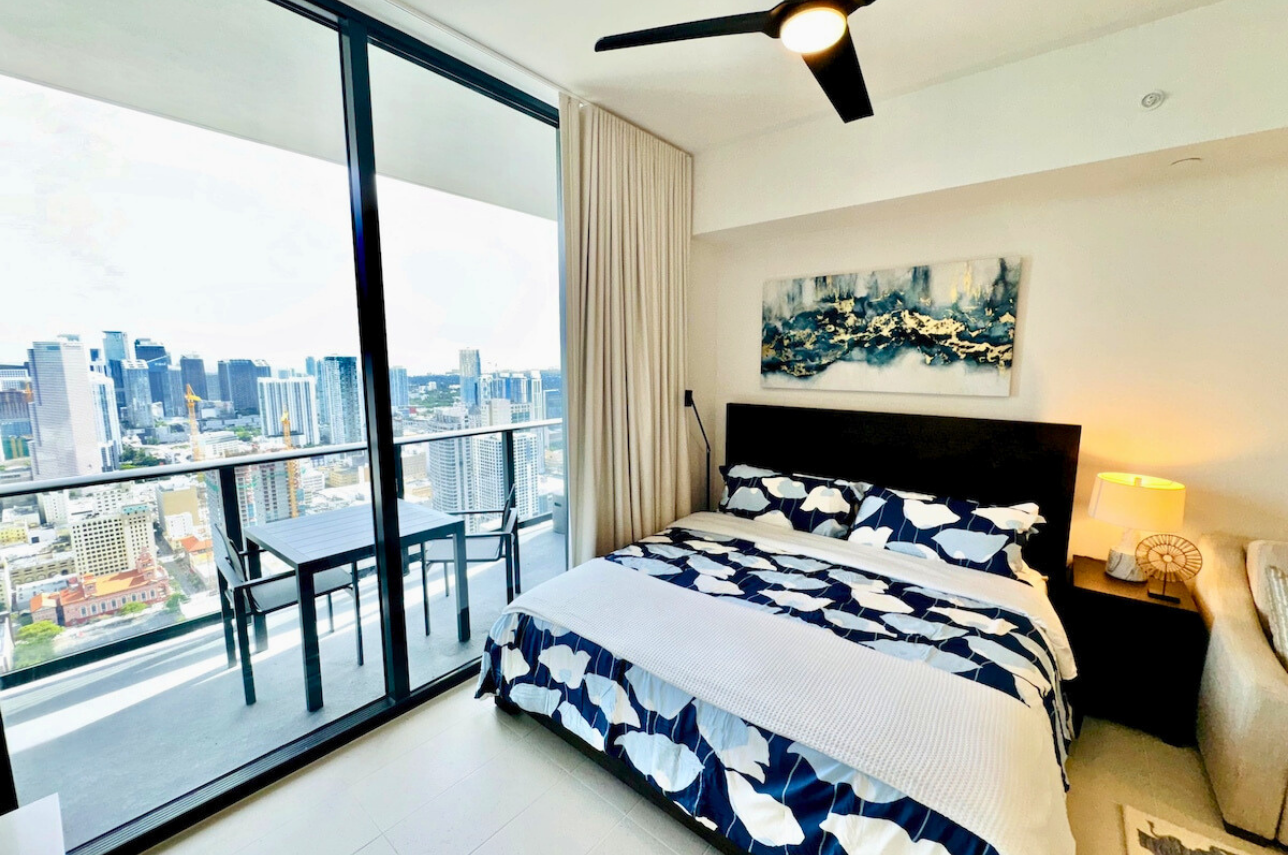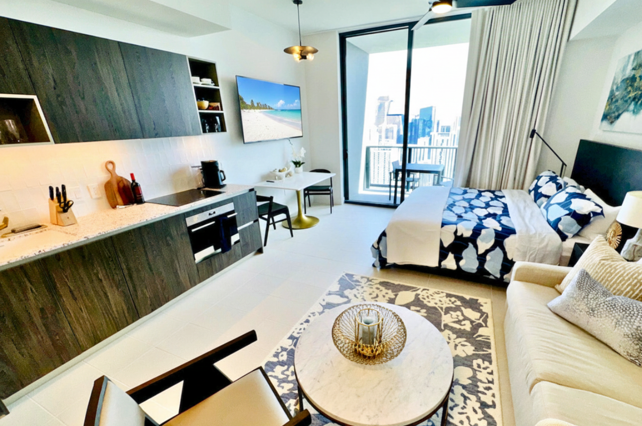 Wake up above the skyline in this high-floor penthouse studio. Enjoy sweeping city and Brickell views from your private balcony, while inside, experience a plush king bed, a 45″ Smart TV, fast Wi-Fi, and a fully equipped luxury kitchen with SMEG appliances. Designed with dark wood, gold accents, and soft neutrals, this studio is perfect for a stylish Miami stay for up to 2 guests.