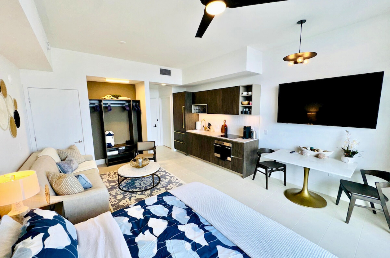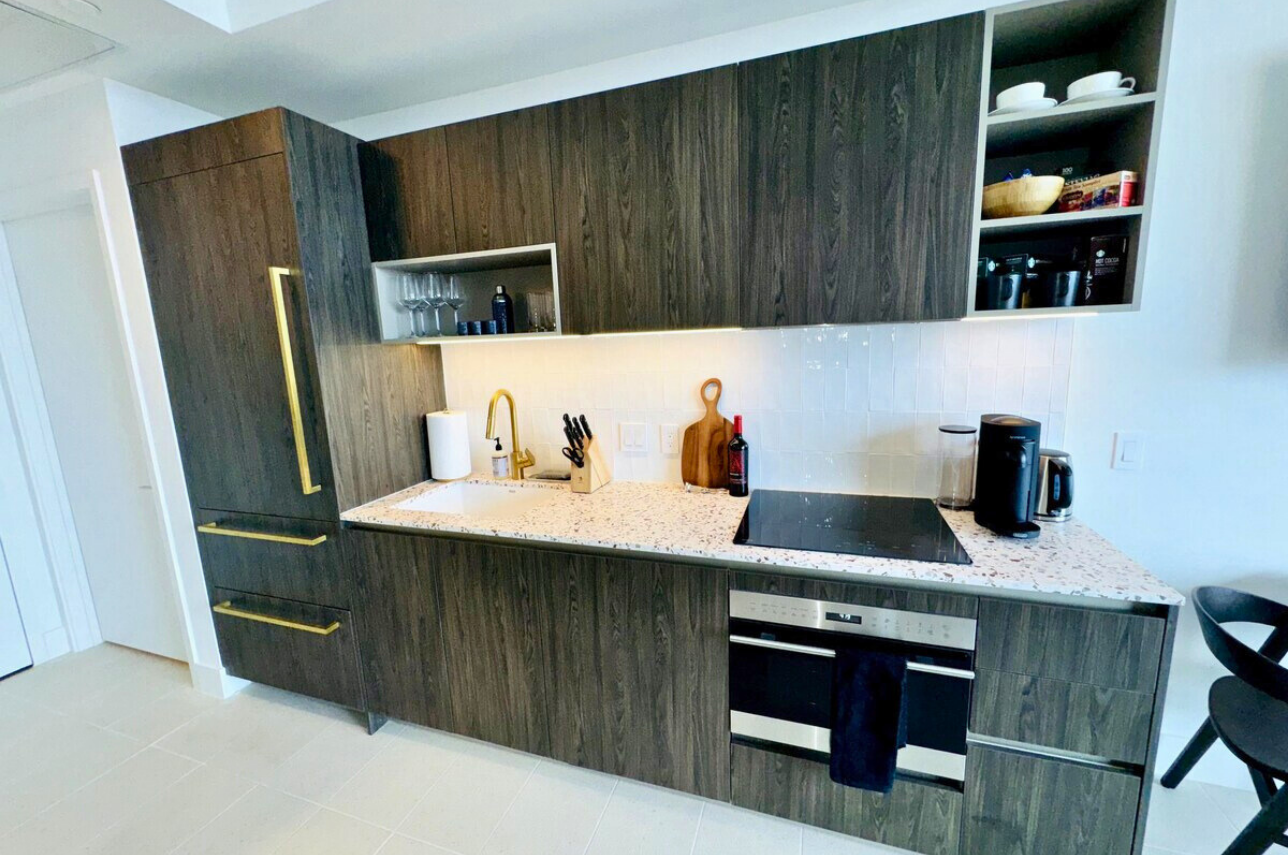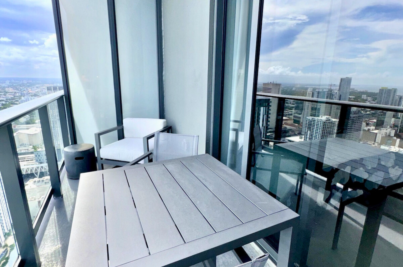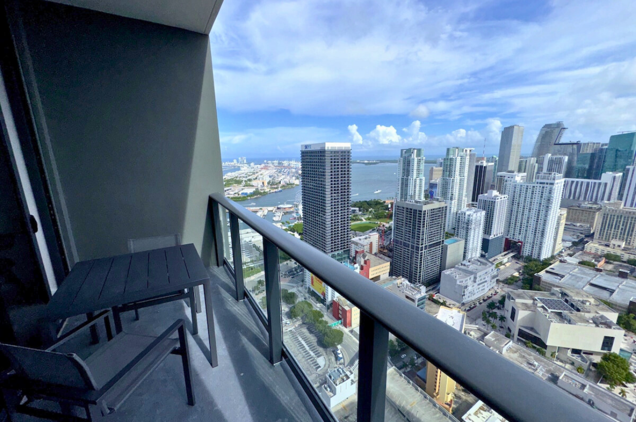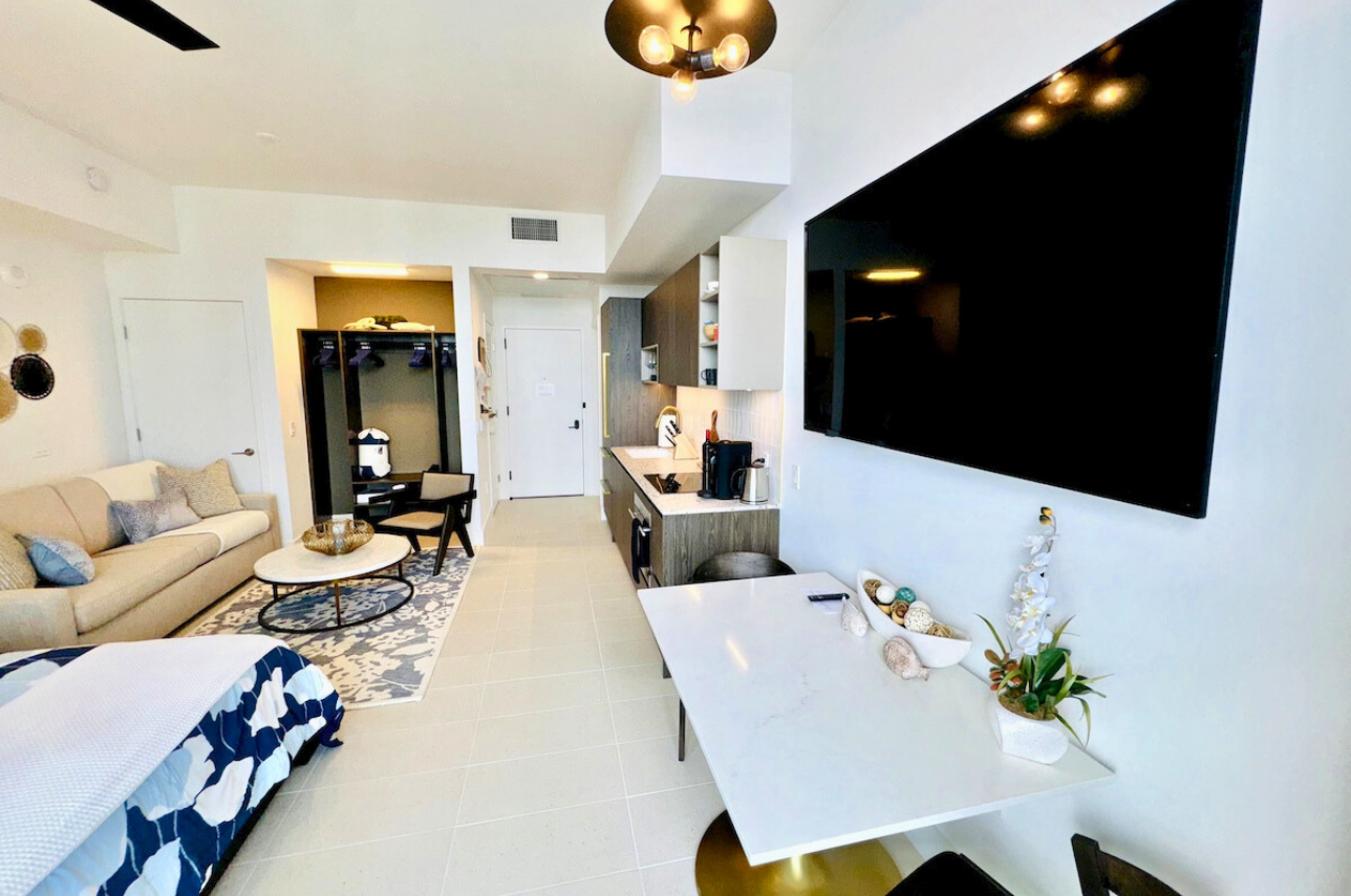 Wake up above the skyline in this high-floor penthouse studio. Enjoy sweeping city and Brickell views from your private balcony, while inside, experience a plush king bed, a 45″ Smart TV, fast Wi-Fi, and a fully equipped luxury kitchen with SMEG appliances. Designed with dark wood, gold accents, and soft neutrals, this studio is perfect for a stylish Miami stay for up to 2 guests.