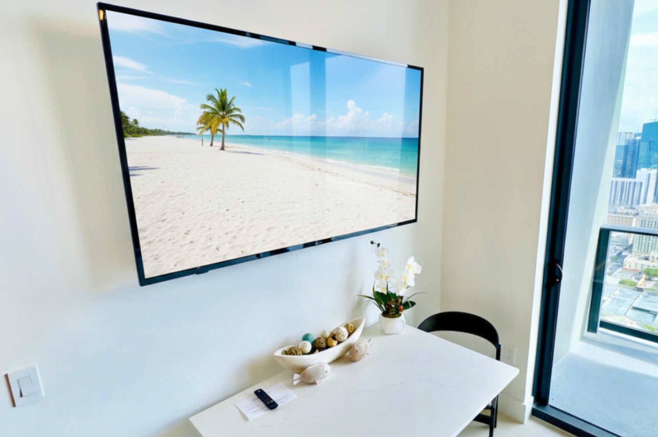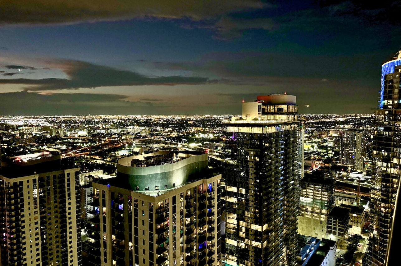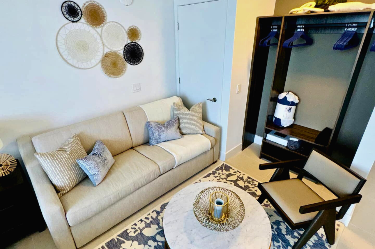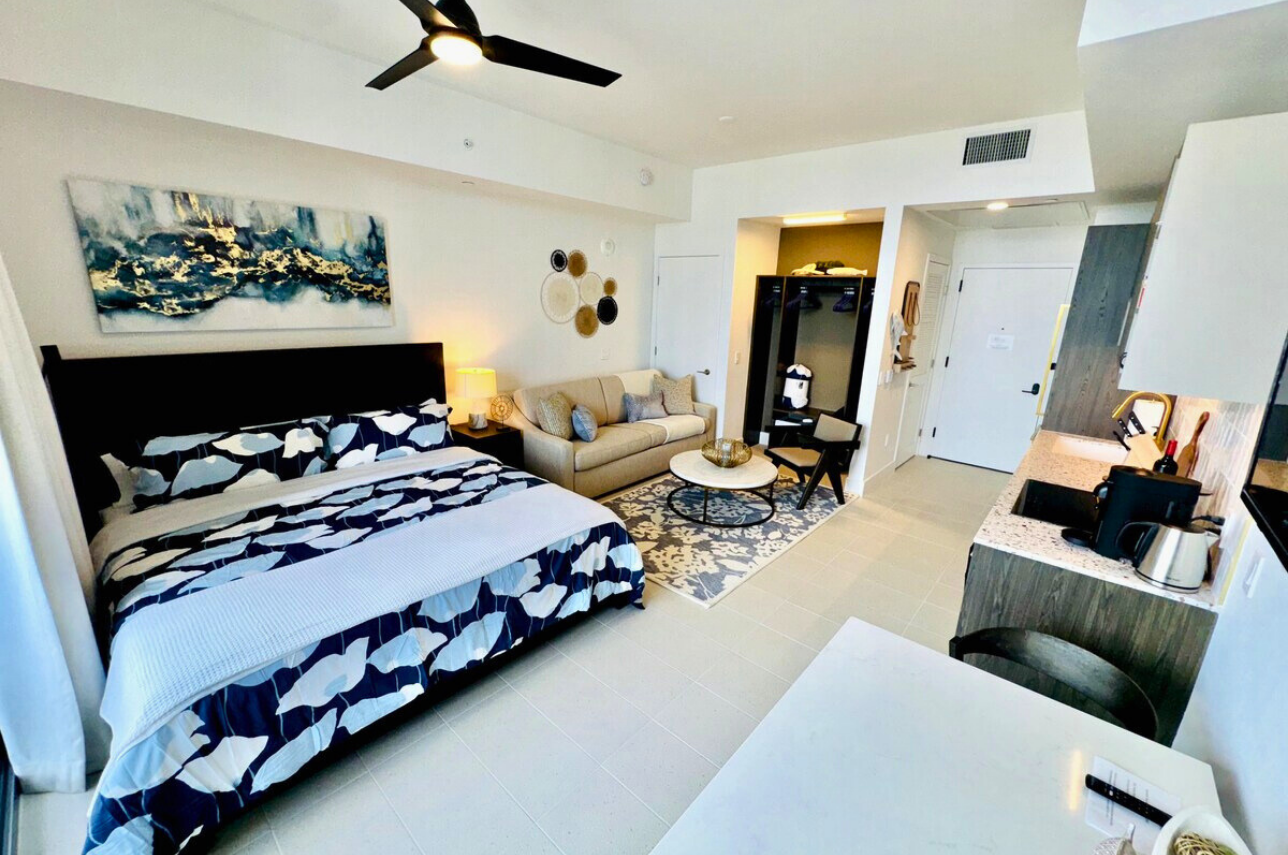 Wake up above the skyline in this high-floor penthouse studio. Enjoy sweeping city and Brickell views from your private balcony, while inside, experience a plush king bed, a 45″ Smart TV, fast Wi-Fi, and a fully equipped luxury kitchen with SMEG appliances. Designed with dark wood, gold accents, and soft neutrals, this studio is perfect for a stylish Miami stay for up to 2 guests.