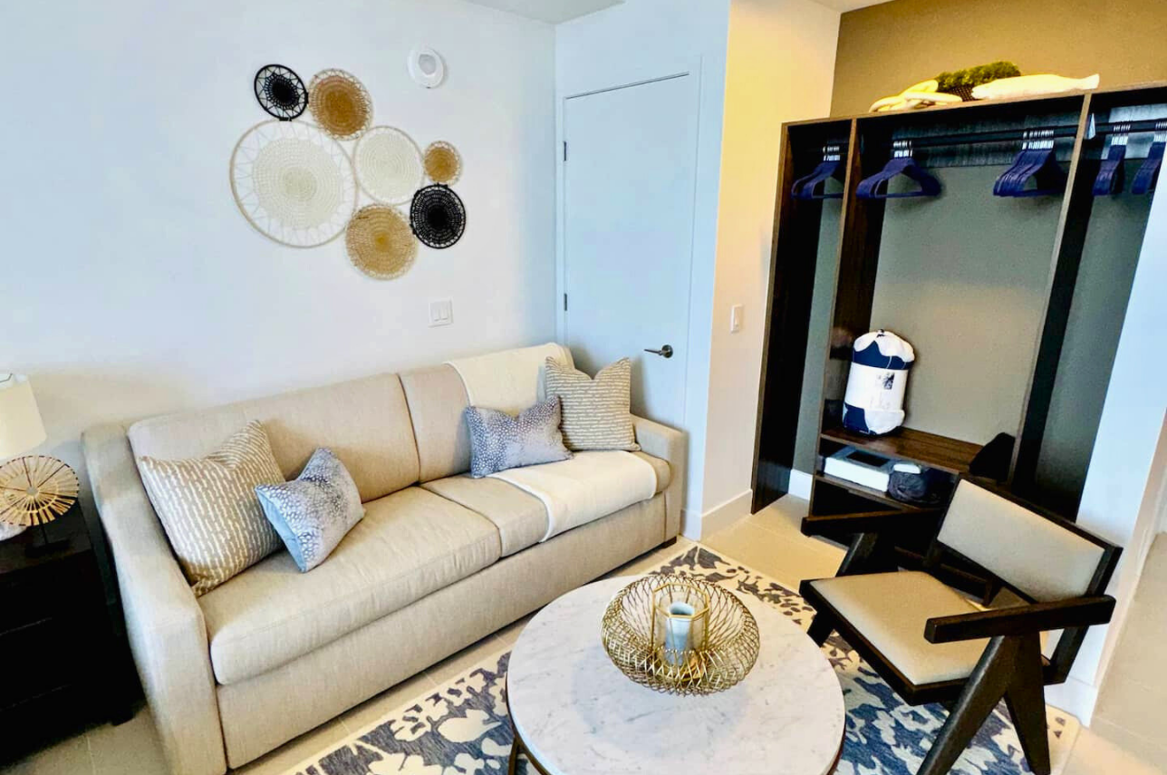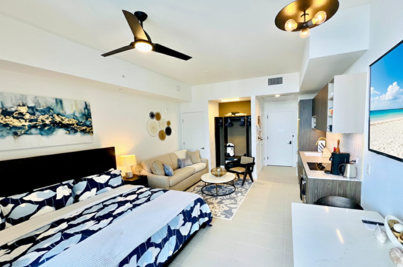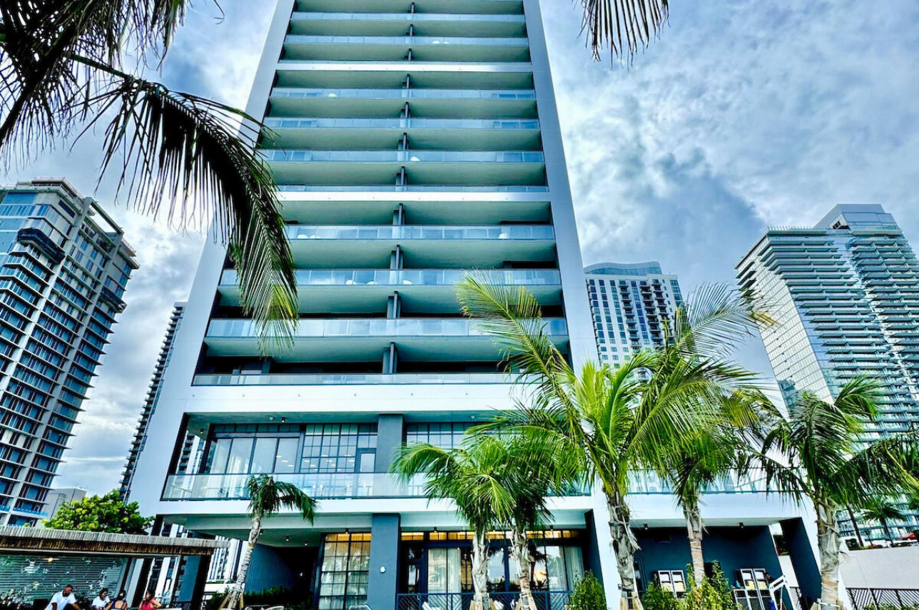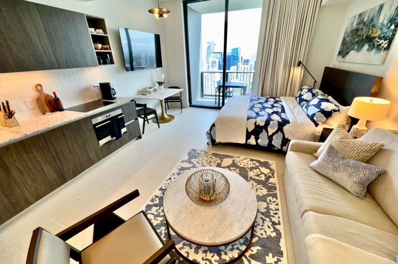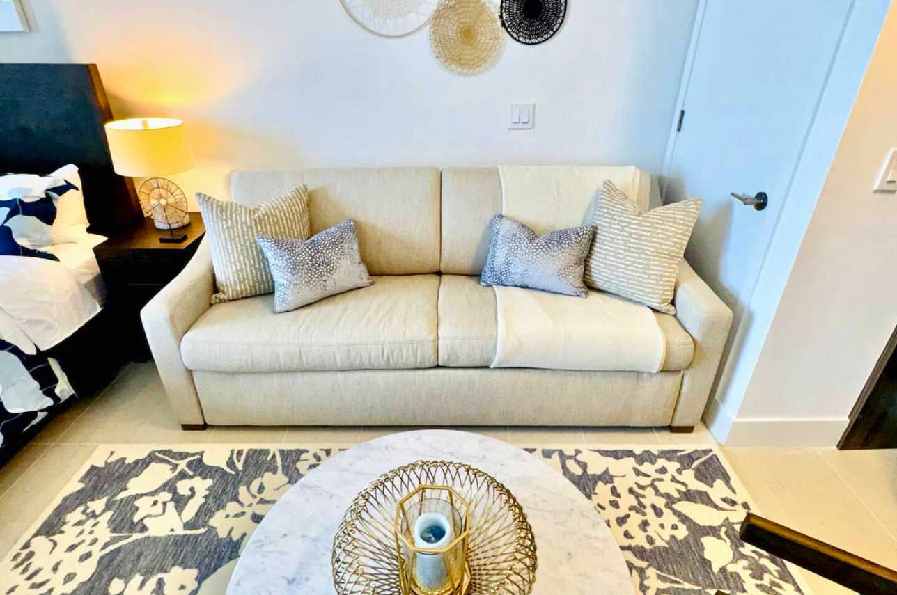Wake up above the skyline in this high-floor penthouse studio. Enjoy sweeping city and Brickell views from your private balcony, while inside, experience a plush king bed, a 45″ Smart TV, fast Wi-Fi, and a fully equipped luxury kitchen with SMEG appliances. Designed with dark wood, gold accents, and soft neutrals, this studio is perfect for a stylish Miami stay for up to 2 guests.