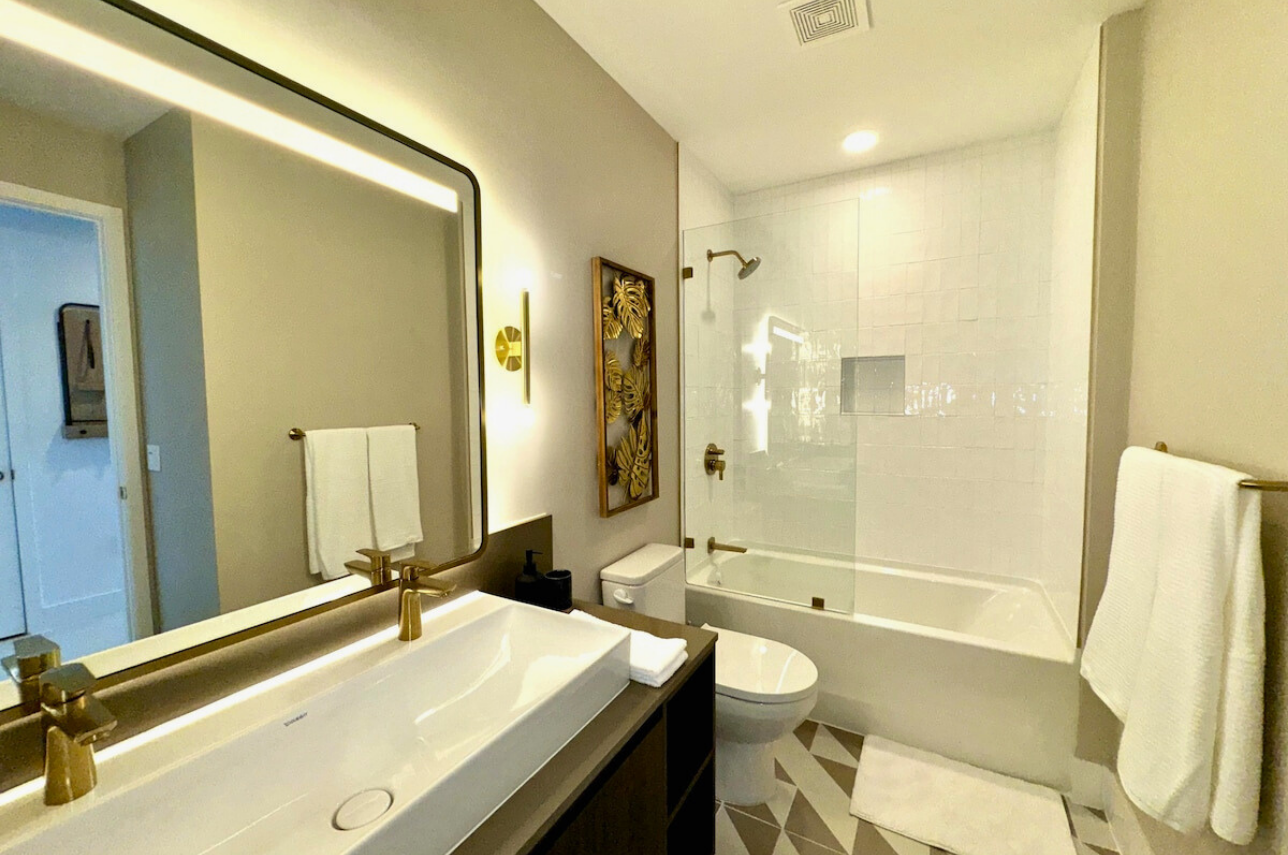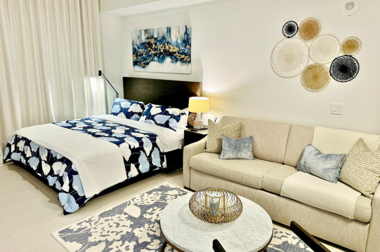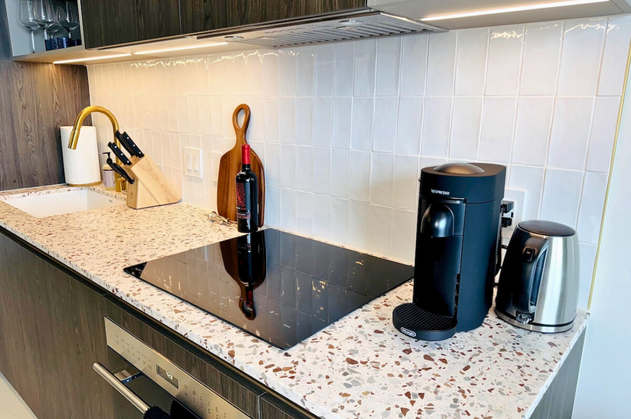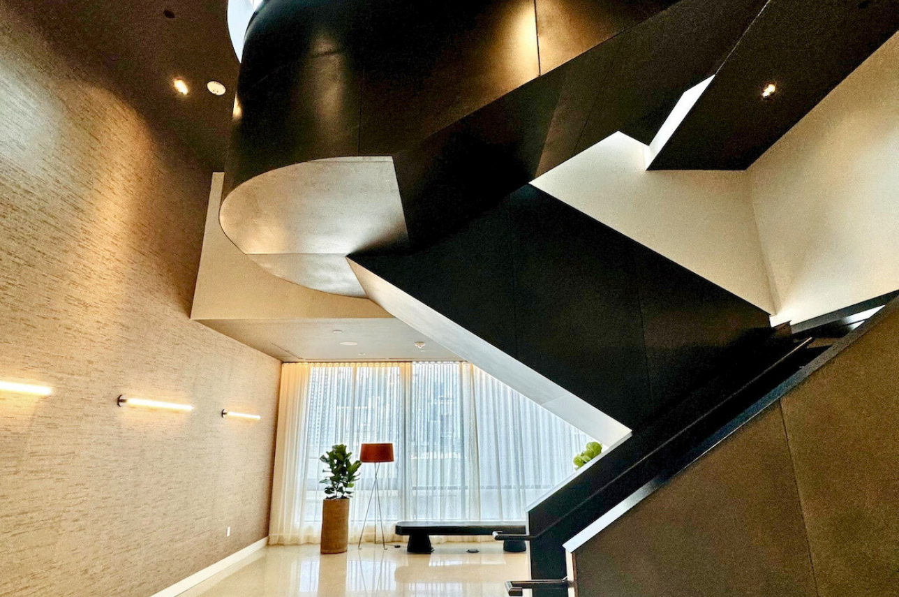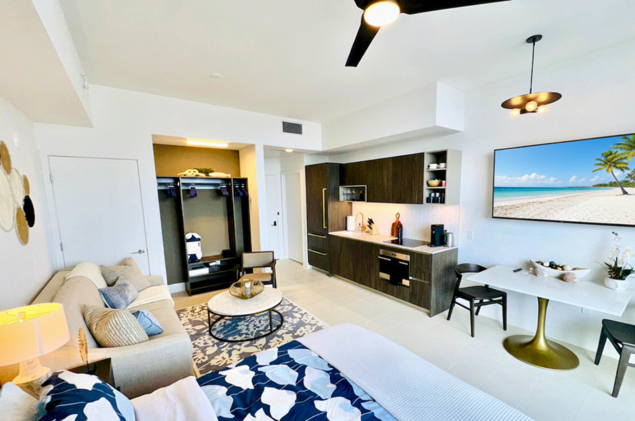 Wake up above the skyline in this high-floor penthouse studio. Enjoy sweeping city and Brickell views from your private balcony, while inside, experience a plush king bed, a 45″ Smart TV, fast Wi-Fi, and a fully equipped luxury kitchen with SMEG appliances. Designed with dark wood, gold accents, and soft neutrals, this studio is perfect for a stylish Miami stay for up to 2 guests.